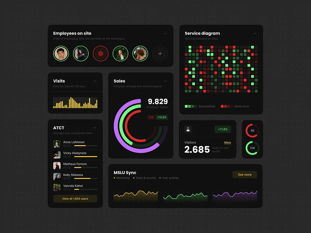 A dark-mode analytics dashboard concept exploring how to present dense, multi-layered data without losing visual clarity. The layout combines employee tracking, sales metrics, service status heatmaps, and activity timelines into a modular card system β each component designed to work both independently and as part of a larger dashboard. The challenge was balancing information density with readability, using color coding, micro-charts, and typographic hierarchy to guide the eye naturally across the screen.