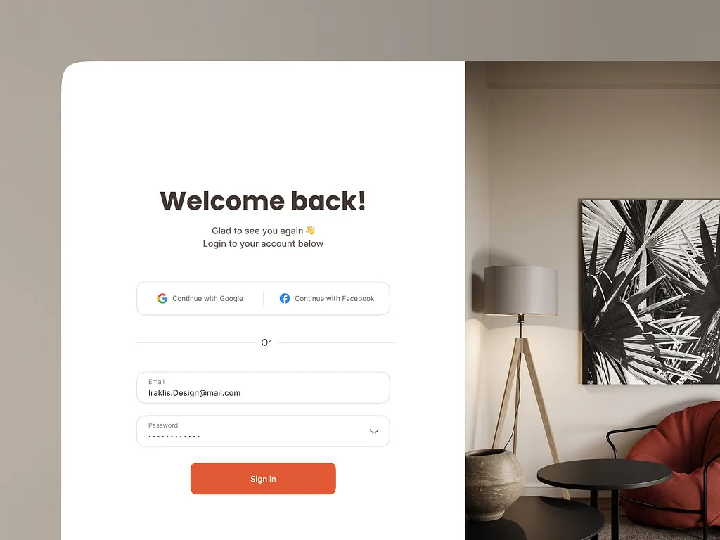 A minimal login page exploration focused on making authentication feel warm and inviting rather than cold and transactional. The split-layout pairs a clean white form with a full-height lifestyle image, creating a sense of context and brand personality from the very first screen. Social sign-in options sit above the traditional email and password fields, nudging users toward the fastest path while keeping the fallback easily accessible.