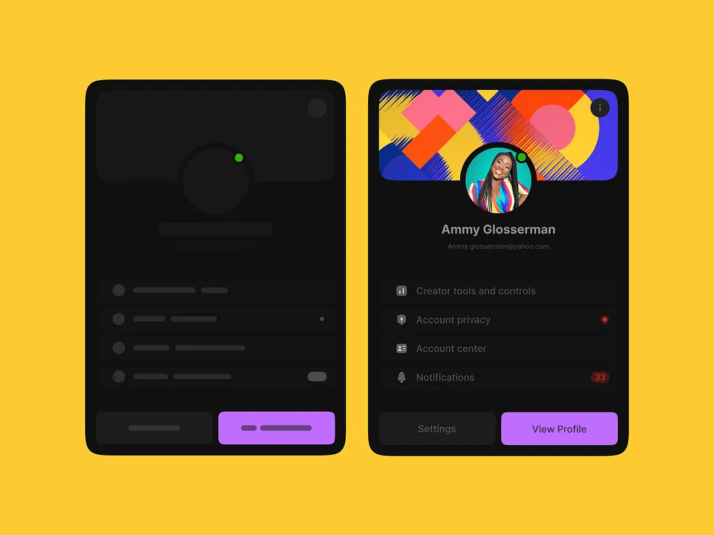 A side-by-side exploration showing the transition from low-fidelity wireframe to polished UI for a mobile profile and settings screen. The exercise highlights how structural decisions made at the wireframe stage β layout, hierarchy, action placement β carry directly into the final design with minimal rework. Seeing both states together demonstrates a disciplined design process where functionality is validated before visual polish is applied.