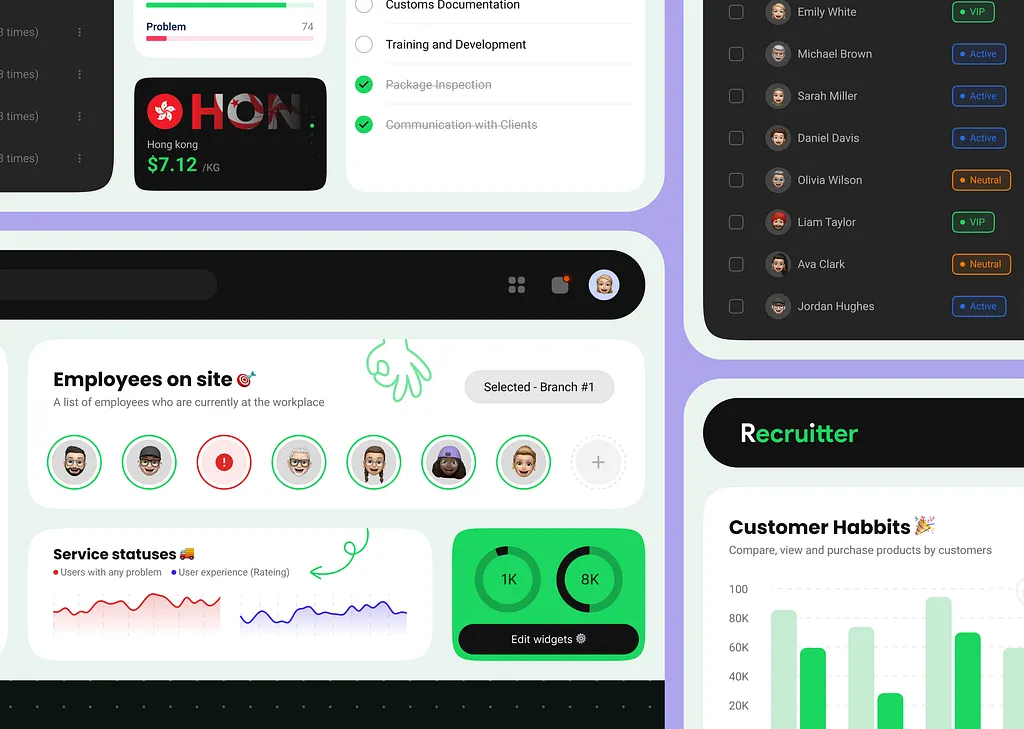 A second-iteration dashboard design for a recruitment and workforce management platform, combining employee tracking, service status monitoring, and customer behavior analytics in one unified interface. The design explores how to serve multiple user roles β recruiters, managers, and analysts β within a single view without creating cognitive overload. Playful touches like emoji avatars and hand-drawn annotations bring personality to an otherwise data-heavy environment, keeping the experience human despite the complexity.