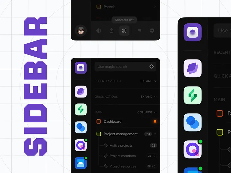 An in-depth exploration of sidebar navigation patterns for complex, multi-section web applications. The concept tackles one of the harder problems in product design β how to accommodate deep navigation hierarchies, quick actions, recent history, and global search without making the interface feel cluttered or overwhelming. Collapsible sections, icon-based app switching, and a magic search input work together to give power users speed while keeping casual users oriented.
