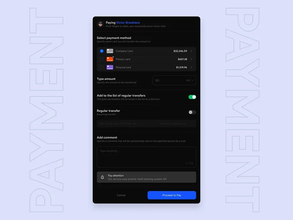 A payment modal concept for a SaaS banking platform, focused on clarity and trust at a critical user decision point. The challenge was fitting multiple input types β card selection, amount entry, transfer settings, and comments β into a single screen without overwhelming the user. The dark interface with structured grouping keeps the hierarchy clean, while subtle toggles and inline alerts guide the user through the flow confidently.